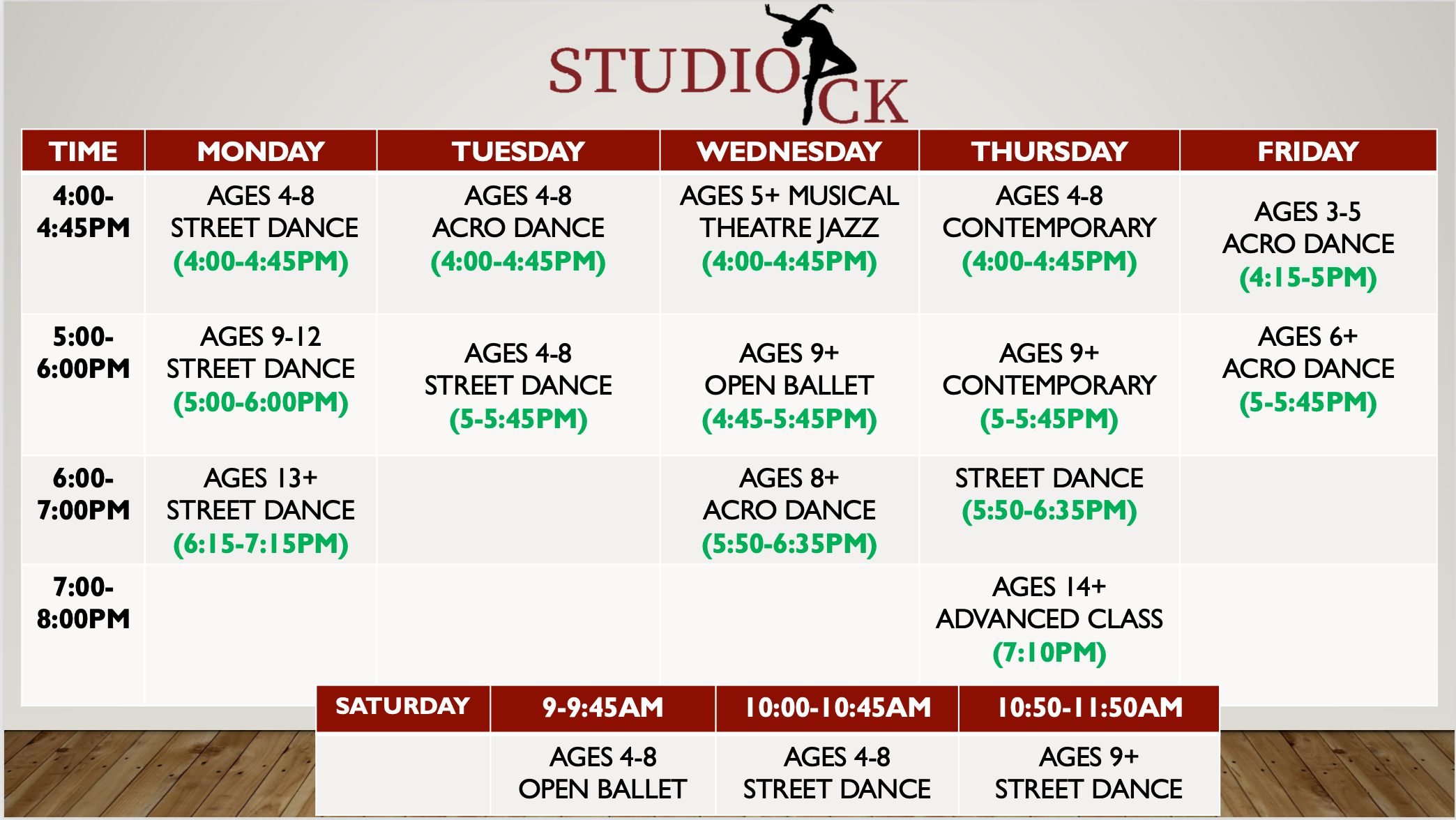 At Studio CK we also offer private lessons for students who like to work on a 1:1 basis or for those who would like to work on specific skills with our teachers. These are offered at 30 minutes or 1-hour sessions. Private lessons can be in any style including Street dance, Acro, Ballet, Contemporary, Jazz, Musical Theatre and more. Those who have private lessons at Studio CK have the opportunity to perform solos choregraphed and rehearsed in their lessons, in our annual show, which is a really great chance to showcase their talent. They are also available for both children and adults of any age. We will discuss time slots with you upon interest in private lessons as we have very limited available. Please contact studiockdance@gmail.com for more information on private lessons and how to book.